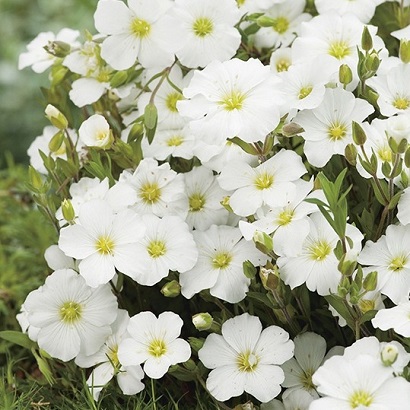 Аренария монтана (песчанка горная) Близзард (Arenaria montana Blizzard). Это самая однородная серия из представленных на рынке (высота 12 см) традиционной аренарии (песчанки).