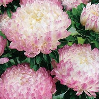Астра пионовидная Кварцевая башня. Растение высотой 60-65 см. Соцветия белые с розовым краем, махровые, диаметром 8-10 см, до 10 штук на растении. Используют очень широко: для посадки в сборные цветники группами, на рабатки - рядами и на срезку.