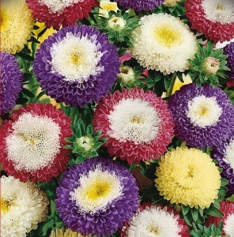 Астра помпонная Суприм микс. Соцветия плоскоокруглые разноцветные с бело-желтым центром. Одновременно на растении до 30 соцветий! Используют очень широко: для посадки в сборные цветники группами, на рабатки рядами и на срезку.