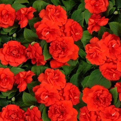 Бальзамин Том Самб Скарлет. Компактный куст с густой листвой, высотой около 45 см. Цветы красные. Цветет обильно с июня по сентябрь. Используют для клумб, рабаток.