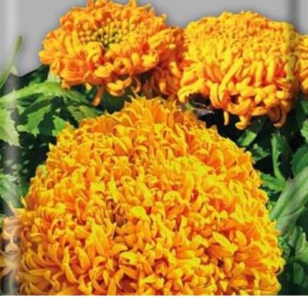 Бархатцы прямостоячие Спун золотые. Растения высотой около 40 см. Цветы шарообразные, крупные, махровые, золотого цвета. Цветет с июля до заморозков. Чтобы продлить цветение, необходимо удалять увядшие цветки. Используют для клумб, рабаток. Растения очень выровненные, прекрасно подходят для ковровых композиций.
