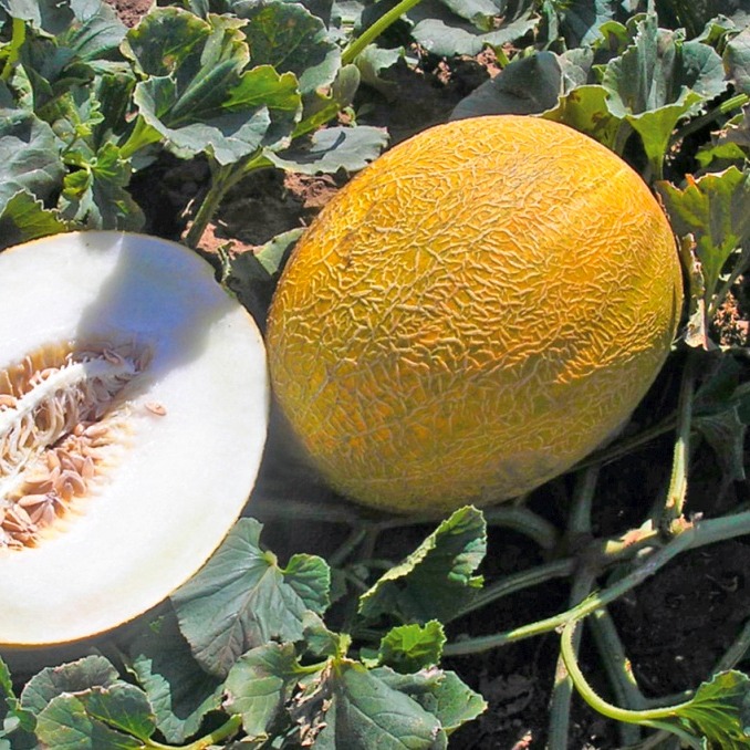• Плод округлый, темно-желтый, без рисунка, слабосегментированный, сильноморщинистый с толстой сплошной сеткой.