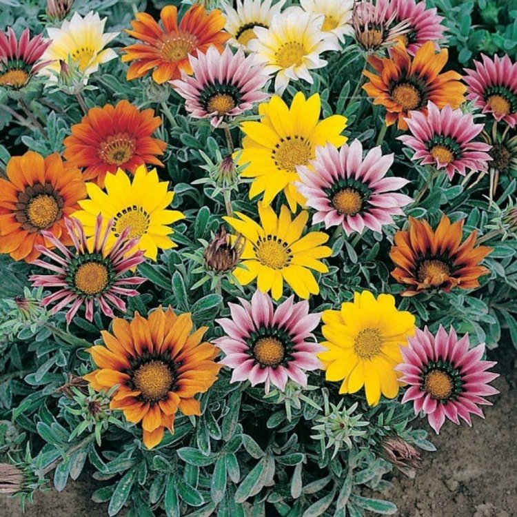 Газания Садовая звезда. Компактное растение высотой около 20 см, с прочными цветоносами. Листья линейные и пальчато-рассеченные, зеленые, с серебристым опушением, собраны в прикорневую розетку. Соцветия-корзинки эффектные, крупные, 7-8 см в диаметре, окрашены контрастными полосками. Цветет с июля до заморозков. Используют в самых различных цветниках, как бордюрное растение, как почвопокровное растение.