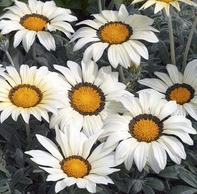 Газания Фрости Кисс (Gazania rigens Frosty Kiss). Самая раннецветущая и наиболее однородная серия с серебряными листьями, представленная на рынке.