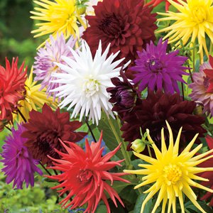 Георгина Кактус Фловеред микс. Растения высотой около 130 см. Цветы крупные, самых разнообразных оттенков. Цветет с июля по октябрь. Используют в цветниках большими группами на клумбах. Прекрасный материал для срезки.