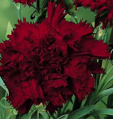 Гвоздика Гренадин Король в черном. Сильноветвистое растение высотой 50-70 см. Листья узколинейные, иногда с сизым налётом. Цветки махровые, ароматные, диаметром 5 см, края лепестков зазубренные. Окраска тёмно-пурпурная. К концу 1-го года выращивания образуется розетка прикорневых листьев. На следующий год растение обильно цветёт с июня по август. Используют для срезки, посадок в горшки, сборные цветники, на рабатки.