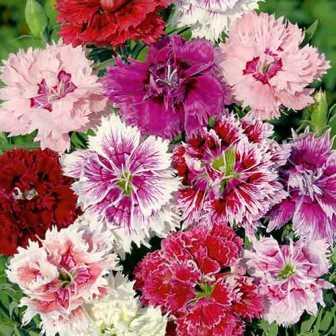 Гвоздика Китайская Смесь окрасок. Растение с тонкими, узловатыми стеблями, высотой 30 см. Цветки собраны в небольшие соцветия-щитки. Края лепестков звездчато-рассеченные. Окраска белая, розовая, красная, тёмно-красная. Цветение обильное, продолжительное. Используют для оформления цветников, бордюров, балконов и на срезку.