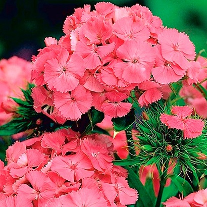Гвоздика Турецкая Ньюпорт Салмон Пинк. Кустик высотой 50 см. Окраска лососево-розовая. Листья линейно-ланцетные, зеленые. К концу 1-го года выращивания образуется розетка прикорневых листьев. На следующий год растения цветут с конца июня в течение месяца. Используют для сборных цветников, рабаток и для срезки.