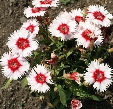 Гвоздика китайская Валентина (Dianthus chinensis Valentine) цветет небольшими двухцветными цветками 3-4 см в диаметре.