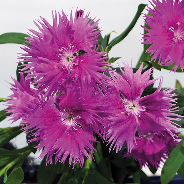 Гвоздика Супра (Dianthus interspecific Supra). Компактная межвидовая гибридная гвоздика с хорошим боковым ветвлением и крупными ажурными игольчатыми цветками до 4 см в диаметре.