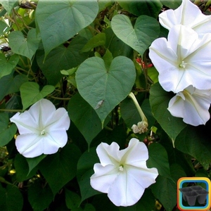 Ипомея лунноцветущая Белая. Растение более 3 м в высоту, несущее крупные, внизу сердцевидные, в верхней части побегов трехдольчатые листья, которые создают водо- и светонепроницаемый покров. Цветки белые, душистые. Цветет с июля-августа и до первых заморозков. Используютв посадках вокруг беседок, у входа в дом, на решетчатых окнах.