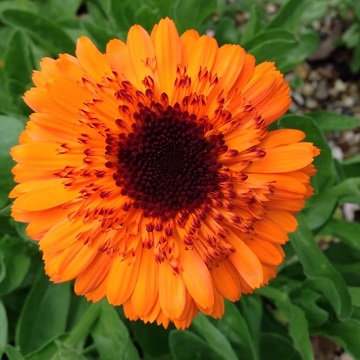 Календула махровая Индиан принц. Махровые крупные цветы с необычной двухцветной окраской. Растение густоветвистое, высотой около 60 см. Соцветия крупные с черепитчато-расположенными язычковыми цветками, ярко-оранжевыми сверху, с оборотной стороны коричнево-красными. Цветёт с июля по сентябрь. Используют для клумб, рабаток, бордюров и срезки.