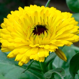 Календула низкорослая Фиеста желтая. Куст компактный, густоветвистый, высотой 25-30 см. Соцветия махровые, диаметром 4 см, желтой окраски с темным центром. Цветёт с июля по сентябрь. Используют для обрамления клумб, массовых посадок и украшения балконов.
