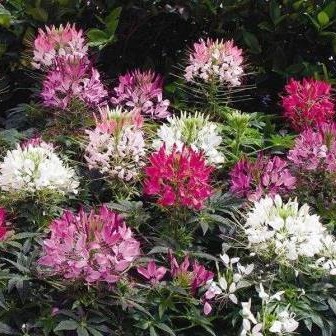 Клеома Смесь окрасок Травянистое растение с прямостоячими стеблями, 80-100 см высотой. Цветки имеют оригинальную форму, четырёхлепестные, 2-3 см в диаметре, на длинных цветоножках, собраны в верхушечные кистевидные соцветия, разнообразной окраски. Цветет обильно с июня по сентябрь. Используют в миксбордерах, групповых и одиночных посадках.