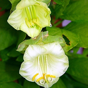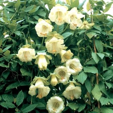 Кобея лазающая Винно-белая. Цепляется за опору усиками, образует многочисленные побеги до 3 м. Листья перистые. Цветы белые, колокольчатые, диаметром 6-8 см. Цветет с июля до заморозков. Используют для вертикального озеленения, на балконах.