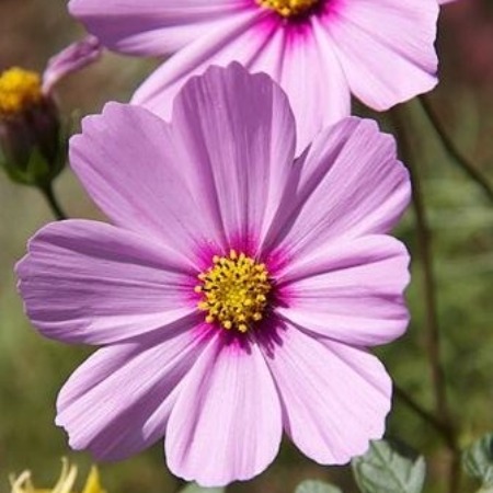 Космея Сенсация Розовая. Растение высотой до 120 см. Цветки собраны в соцветия-корзинки, диаметром 7-10 см и расположены одиночно на концах стеблей. Язычковые цветки розовые. Трубчатые в центре соцветия - желтые. Применяют для посадки на заднем плане цветников, декорирования оград и для срезки.