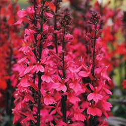 Лобелия прекрасная Старшип (Lobelia x speciosa Starship). Оригинальный многолетник с декоративной листвой, формирующий колос с яркими многочисленными цветками.