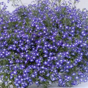 Лобелия Голубой бриз. Красивое травянистое растение, образует плотные кустики высотой всего 10-12 см, с эффектными темно-синими с белым зевом цветками. Цветение обильное и продолжительное с середины июня по октябрь. Используют для обрамления клумб, бордюров, рокарий, балконных ящиков.