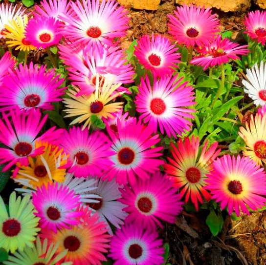 Мезембриантемум Арлекин. Относится к стелящему, травянистому, кустистому многолетнику. Толстые, мясистые, желтые слегка белые, стебли имеют высоту до 15 см. Может обильно разрастаться, образовывая ползучие побеги. Листья имеют одинаковый с стеблями цвет. Листья и побеги покрыты волосинками, напоминающие хрустальные капли. Цветки крупные и похожи на маргаритки, благодаря тоненьким лепесточкам. Обычно цветки имеют диаметр около 4-5 см. Садоводы предпочитают данный сорт, из-за возможности создавать оригинальные рокарии, бордюры, каменистые горки.