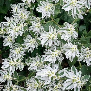 Молочай окаймленный (Euphorbia marginata). Красивый однолетний цветок из семейства Молочайные,  В цветнике кусты молочая очень похожи на “снежные шары”. Широкая белоснежная кайма, проходящая по краю верхних листьев, делает растение весьма декоративным. Растет молочай очень быстро и к осени достигает высоты 80-100 см. Зацветает в середине лета невзрачными мелкими цветками. Цветение длится до заморозков.