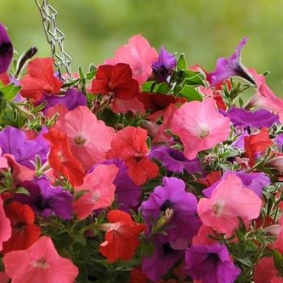 Петуния ампельная Изи Вейв(Easy wave) F1. Серия исключительно однородных, с хорошим габитусом и широкой цветовой гаммой, петуний. Самая простая в выращивании и наиболее универсальная из всех ампельных петуний с крупными цветами.Для данной серии характерна выровненность кустов различных расцветок. Считается полуампельной петунией, т.к. образует куполообразную шаровидную крону. Может использоваться в подвесных кашпо, но лучше смотрится в кашпо, расположенном на уровне глаз, или в напольном. Также может высаживаться в открытый грунт, где образует сплошной ковер площадью до 1 м2. Наращивает плети длиной до 1 метра. Лучше развивается в объеме не менее 7-8 литров грунта на одно растение (всю красоту покажет, если на одно растение придется не менее 12-15 литров грунта) . Необходимы регулярные подкормки удобрениями и удаление увядших соцветий для более обильного цветения. Прищипывать не нужно (только обрезка для корректировки формы или омоложения растения). Отмеченные плюсы: очень плотное цветение (не видно листвы), одинаковый габитус и темпы роста разных расцветок, что позволяет создавать гармоничные композиции и смеси.