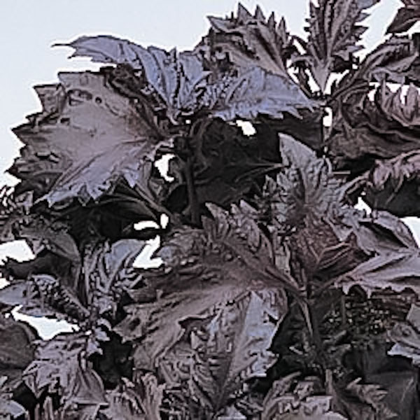 Базилик декоративный Пёпл Рафлс F1. Привлекательные гофрированные овальные листья базилика остаются темно-фиолетовыми на протяжении всего сезона. Этот сорт базилика отличается от других садовых растений своей тонкой текстурой и изысканной листвой.
