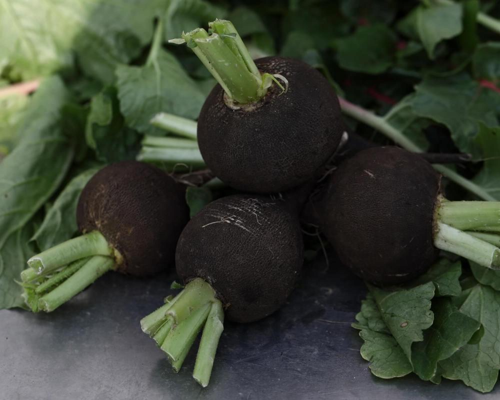 • Корнеплод округлой формы, короткий, диаметром 8-12 см. Кожица черная, головка округлая.