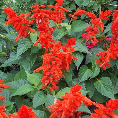 Сальвия сверкающая Скарлет. Высота ее кустов до 30 см. Это небольшие кустики компактные на вид с цельными листами черенковидной формы, окрашены в темно-зеленый цвет на верхней стороне и светло-зеленый с нижней. Их цветки довольно крупные, неправильной формы с двойным околоцветником. Цветы красные, они располагаются в кистях по 2-6 штук. Длина кистей около 14-25 см. Начало цветения с июня до осени.