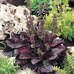 Шалфей лировидный Парпл Волкано. Впечатляющий многолетний сорт сальвии с декоративной листвой. Листья пурпурные, ближе к осени приобретают темно-фиолетовый цвет. Собраны в прикорневую розетку, над которой возвышаются цветоносы с небольшими белыми цветками.