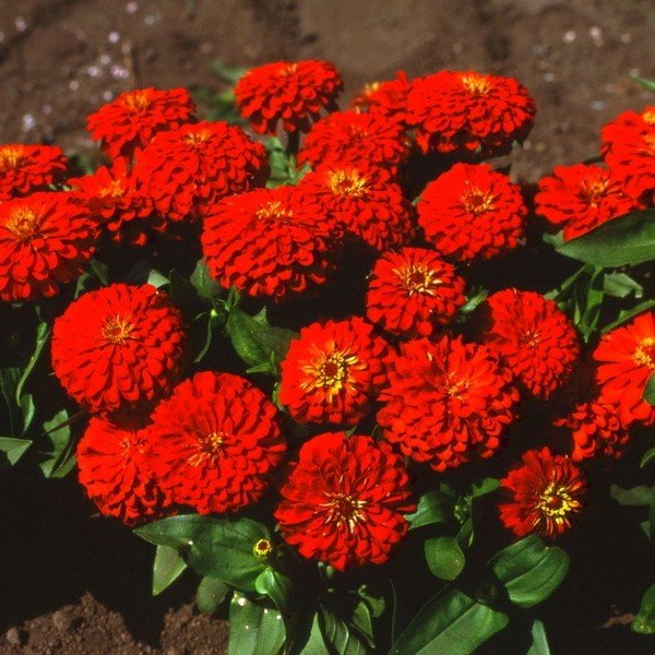 Цинния Лиллипут Красная. Распространенное засухоустойчивое неприхотливое растение, образующее разветвленные кустики до 45-50 см высотой. Многочисленные красные соцветия небольшого диаметра, махровые. Цветет обильно, с июля до октября. Используют в клумбах, рабатках, группах и для срезки.