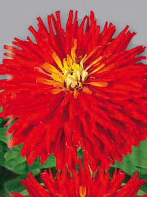 Цинния кактусовидная Бог огня. Растение мощное, ветвистое от основания, высотой 70-75 см. Полушаровидные махровые соцветия, диаметром 8-10 см, ярко-красной окраски. Язычковые цветки узкие, свёрнутые по длине в трубочки, причудливо изогнуты. Цветет с  июля по сентябрь. Широко используют для цветников и на срезку.