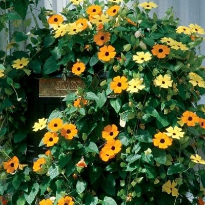 Тунбергия крылатая Смесь окрасок. Эффектные трубчатые цветки, достигающие в диаметре 5 см, отчетливо выделяются на фоне стреловидных листьев. Цветки желтые, оранжевые с темно- пурпурным, кажущимся черным зевом. Цветет с июня по сентябрь. Применяют для украшения беседок, шпалер, колонн, балконов.