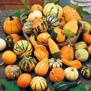 Тыква декоративная Мозаика. Декоративные плоды самой разнообразной расцветки. Растение длиной до 400 см. Плоды в сухом виде служат великолепным украшением различных композиций. Используют для вертикального озеленения, нуждается в прочной опоре.