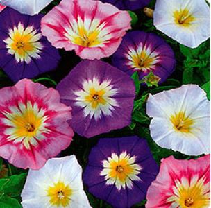 Вьюнок Смесь окрасок. Компактный кустик высотой до 25 см. Цветки, широко открытые граммофончики с яркой желтой серединкой, собраны на концах побегов. Открыты только в ясную погоду. Цветет обильно в течение июня-августа. Используют в рабатках, миксбордерах, для озеленения веранд, балконов, альпийских горок.