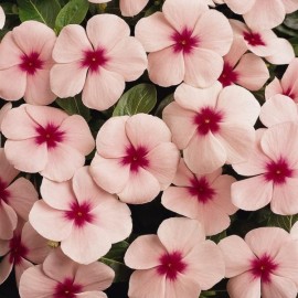 Катарантус Пацифика. Для сортотипа Пацифика характерны ранние сроки цветения, крупноцветковость, компактная, сильноветвистая форма, не требующая формировки, высокая устойчивость к жаре и засухе. Нарядное однолетнее (при выращивании в саду) растение . Растение высотой 25-30 см, диаметром 15-20 см, листья темно-зеленые, цветки до 5 см.Очень благодарное растение, обильно цветет до заморозков. Предпочитает солнечное место, полив, устойчив к жаре и засухе. Семена катарантуса всходят быстро и дружно, никаких проблем с выращиванием его рассады нет! Выращивают на клумбах и в контейнерах. На зиму растение можно занести в дом или зимний сад и выращивать как комнатное.