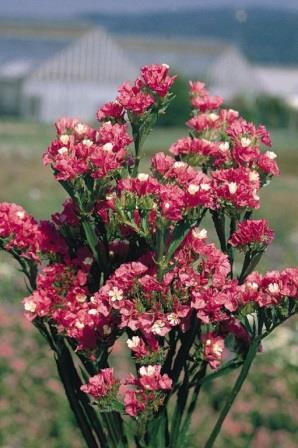 Статица Суприм карминная. Растение высотой до 75 см. Высушенные цветки долго сохраняют свою окраску. Цветет обильно с июля до заморозков. Используют для цветочных аранжировок, рабаток, миксбордеров.