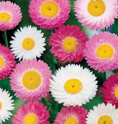 Акроклинум розовый (Гелиптерум) (Helipterum roseum) - однолетнее растение с небольшими нежными соцветиями-корзинками, напоминающими мелкие ромашки. Относится к группе сухоцветов. Красивые белые и розовые цветки похожи на маргаритки, сидят на тонких стеблях высотой до 50 см. Лепестки цветов по структуре напоминают сухие, шуршащие чешуйки. Используют в зимних букетах. Для засушивания цветы срезают почти раскрывшимися.