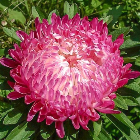 Астра пионовидная Седая Дама.  Пионовидная. Куст компактный, колоновидный, прочный, высотой 50-65см, за период вегетации формирует до 20 соцветий на длинных, прочных, густооблиственных цветоносах. Многочисленные побеги обеспечивают ей необычайно пышное цветение. Соцветия полусферические, махровые, 8-10см в диаметре, не поникающие. Состоят из двуцветных, красно-малиновых с белой полосой, широких язычковых цветков, которые закрывают собой внутренние трубчатые цветки. Красива в ленточных и групповых посадках, возможно использование как горшечной культуры и на срезку.