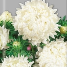 Астра пионовидная Дюшес белая. Куст высотой 70 см. Соцветия белые, 8-10 см в диаметре. Цветет август-сентябрь. Используют для посадки в сборные цветники группами, на рабатки - рядами и для срезки.
