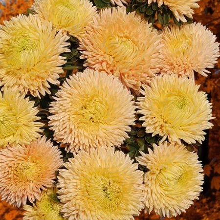 Великолепная форма с  очень эффектным крупным цветком, представляющем собой плотную корзинку от полусферической до шаровидной формы, диаметром от 12 до 15 см. Лепестки ладьевидные, загнутые к центру, очень жесткие, поэтому, цветки не повреждаются дождем.