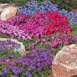 Аубреция (Обриета) Смесь окрасок. Стелющиеся побеги образуют плотные ковры. Большие сине-фиолетовые, лиловые, пурпурные цветки собраны в кисти. Цветёт на второй год с мая по июнь. После цветения желательно произвести обрезку цветоносов, чтобы ограничить рост и вызвать вторичное цветение осенью. Используется для каменистых горок, бордюров и переднего плана рабаток.