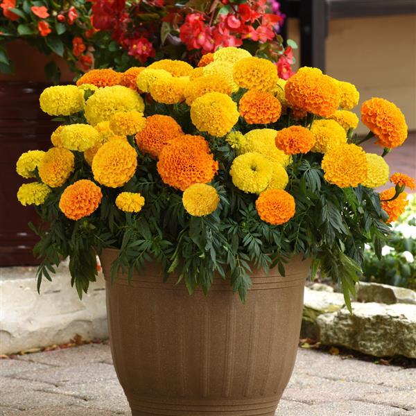 Бархатцы прямостоячие Марвел (Tagetes erecta Marvel II™) - промежуточного типа отличаются улучшенным ветвлением, раннеспелостью, размером цветков и более яркой окраской цветков.