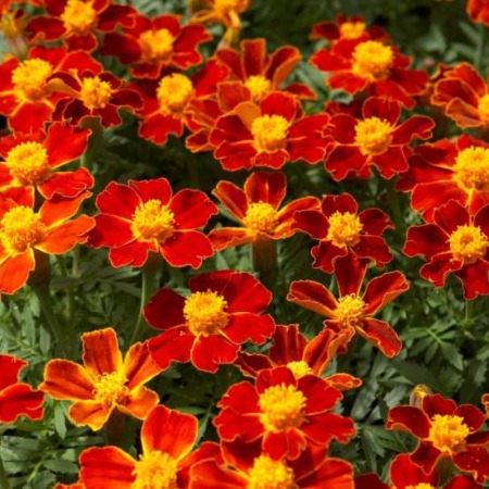 Бархатцы тонколистные Ред Джем. Оригинальные, невзыскательные к условиям произрастания однолетние растения, которые можно использовать для оформления клумб, балконных и оконных ящиков. Высота 30см. Посев в марте-апреле на рассаду. Всходы появляются через 7-14 дней при температуре 18-20С. Пикировка через 3 недели. Сеянцы нормально развиваются при температуре 12-16С. Растения хорошо переносят пересадку. В грунт высаживать, когда минует угроза заморозков, на расстоянии 15-20 см. Возможен посев в грунт в мае. Уход: нетребовательны к почве. Предпочитают солнечное место, но выносят и полутень. Для продления цветения необходимо удалять увядшие соцветия. Цветение через 2-3 месяца после посева.