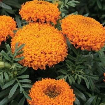 Бархатцы прямостоячие Купид Голден Оранж. Растение высотой до 35 см. Соцветия с выпуклой серединкой и закрученными лепестками, диаметром до 8 см, оранжевой окраски. Обильно и продолжительно цветет с июля до заморозков. Чтобы продлить цветение, необходимо удалять увядшие цветки. Используют для клумб, рабаток, высоких групп и срезки.