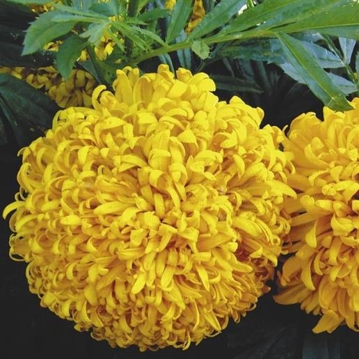 Бархатцы прямостоячие Спун Лимонные. Растения высотой около 40 см. Цветы крупные, махровые и шарообразные, золотистые, жёлтые и оранжевые. Цветет с июля до заморозков. Чтобы продлить цветение, необходимо удалять увядшие цветки. Используют для клумб, рабаток. Растения, очень выровненные, прекрасно подходят для ковровых композиций.
