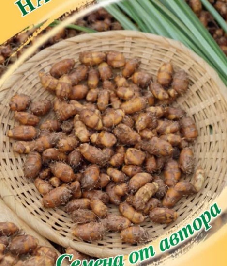 Чуфа Нафаня. Чуфа или земляной миндаль — многолетнее травянистое растение семейства осоковые. Синонимы: сыть съедобная, тигровый орех, зимовник, ореховый ситник и др. Культивируется как однолетнее пищевое растение из-за съедобных клубеньков на корнях. Относится к роду сыть. Высота растения 30–70 см. Корневая система хорошо развита и разветвлена, в ней образуются маленькие клубеньки. По форме они овальные, иногда вытянутые, шириной до 1 см и длиной до 3 см. На одном растении образуется 200–400 шт. клубеньков. Высевают в конце апреля–начале мая по схеме 30x50 см. Начало плодоношения через 70 дней после всходов. Урожайность 0,5–1,0 кг/м2.