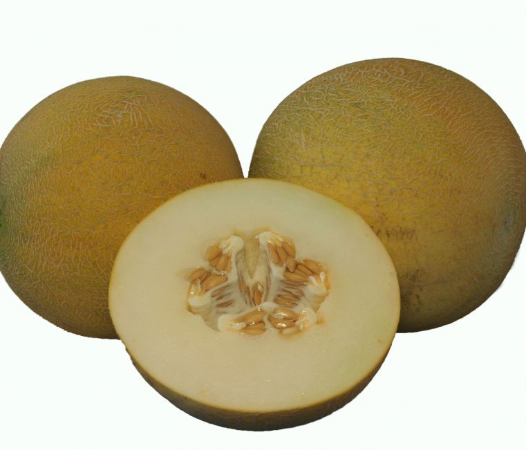 Дыня Сенсейшен F1. Уникальная дыня типа Галия, отличающаяся крупными плодами, великолепным вкусом и текстурой. Очень сладкая и ароматная. 85 дней от всходов до уборки урожая, плод 2,5-3,5 кг, круглый. Кожура с сильной сеткой, оранжево-жёлтая с лёгкой зеленью. Мякоть белая, вначале хрустящая, при созревании – нежно-маслянистая. Семенная камера маленькая. Устойчива к настоящей мучнистой росе и фузариозу (расы 0,1,2).