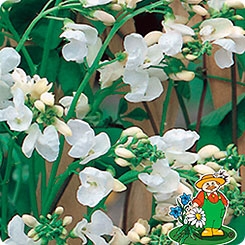 Фасоль вьющаяся Белая. Стебли тонкие, поднимаются на высоту 2,5 м. Листья многочисленные, темно-зеленые. Цветы белые в пазушных кистях на длинных цветоносах. Цветет обильно с июля до сентября. Декоративную ценность представляют и плоды растения - крупные, шероховатые бобы. Используют для вертикального озеленения и устройства пирамид на газонах.