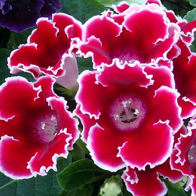 Глоксиния Импресс. При благоприятных условиях одновременно появляются до 20 бутонов на одном растении. Хорошо растет в достаточно освещенных местах, но без прямых солнечных лучей. Полив постоянный, обильный; избегая попадания воды на листья и цветки, лучше применять полив в поддон. Почвенная смесь: листовая, торфяная земля, сфагнум, песок в отношении 1:1:1:1. После цветения у растения наступает период покоя.