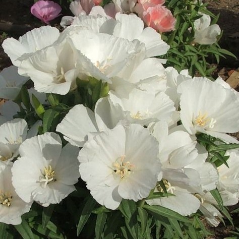 Годеция крупноцветковая Вейсер Страус. Растение высотой около 40 см. Крупные цветы белые с волнистыми краями. Цветет обильно с июля по октябрь. Используют для переднего края бордюров, рабаток, клумб.